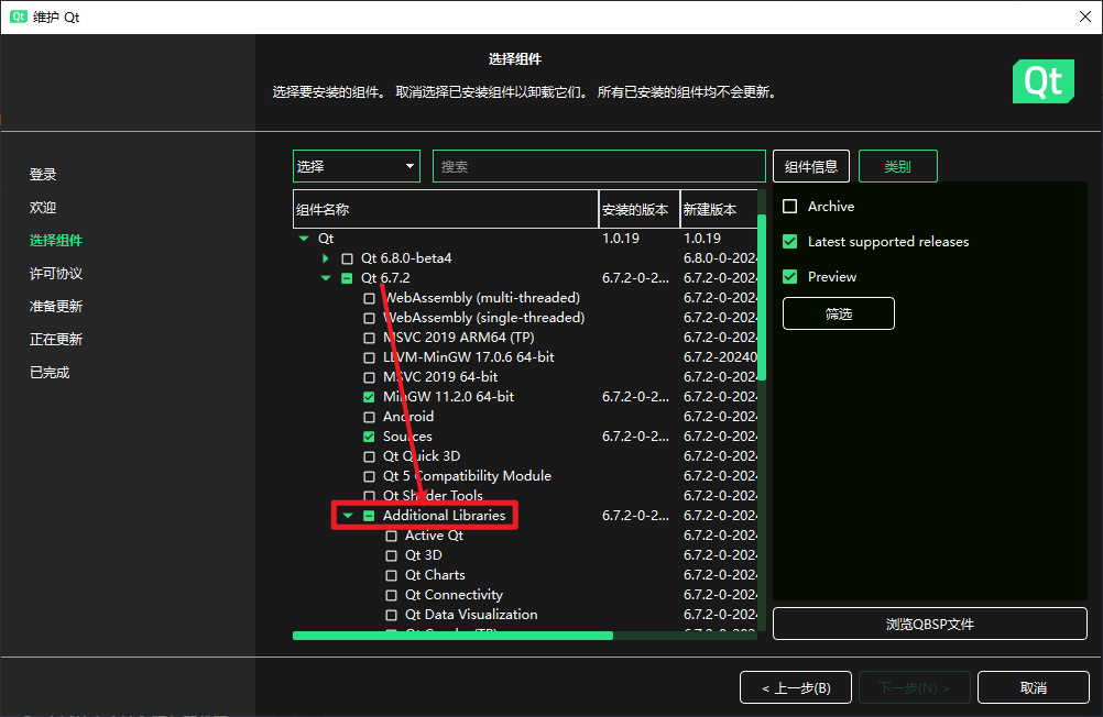 展开Additional Libraries节点之后,找它的子选项Qt WebSocket: